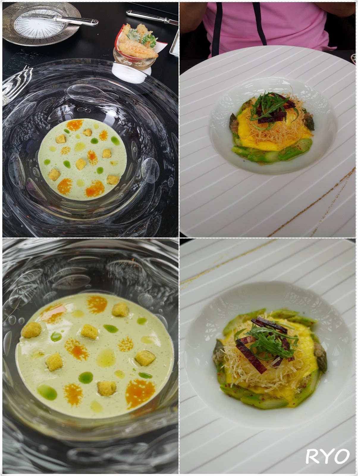 頭盤:鮮蟹肉伴牛油果,番茄啫喱及芫茜凍湯配天婦羅(左) & 香脆蛋配煮白蘆筍及清新檸檬露(右)