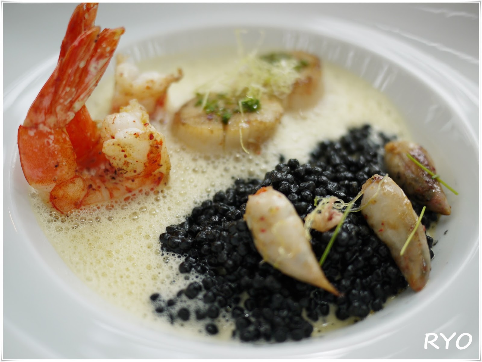 魚類:香煎帶子,鮮蝦及魷魚伴墨汁珍珠意粉,紅花青口露