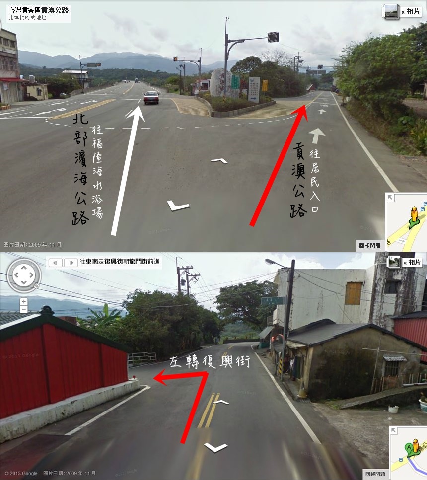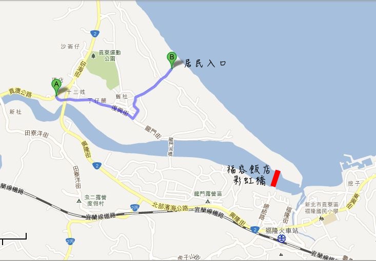 查了Google地圖,在抵達福隆海水浴場前的2.3km處,可以右轉至貢澳公路,再左轉復興街,沿著小路到海邊,即可到達上述的居民入口。