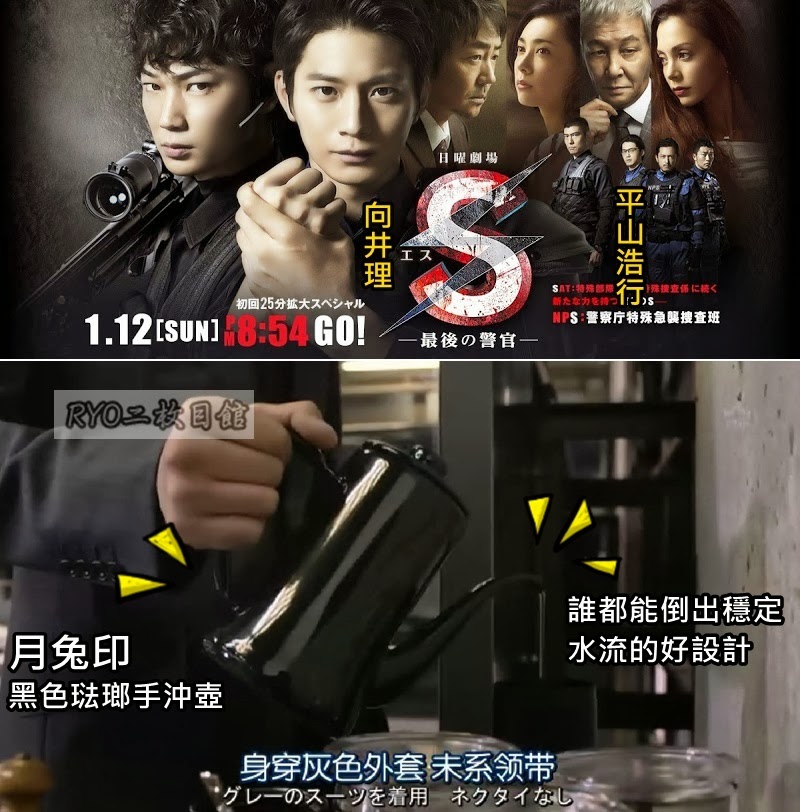 例如,由日本帥哥向井理擔綱S最后的警官(或稱S-終極警官)主角神御藏一號的戲劇中,同屬NPS的速田仁(由平山浩行飾演),當鏡頭帶到NPS辦公室時,一定會帶到平山浩行拿著黑色的月兔印手沖壺沖煮咖啡。